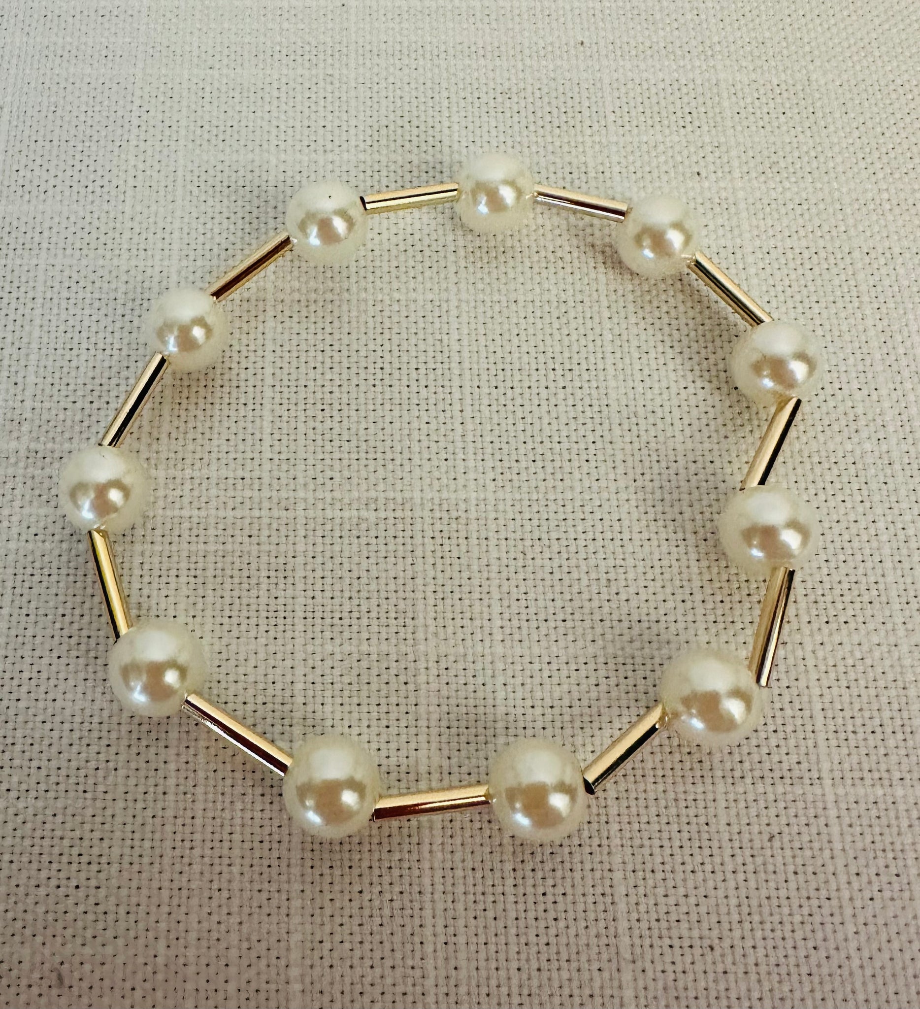 This 11 pearl and gold stretch bracelet is perfect for any outfit or to add to any stack bracelet set. It will add a touch of elegance to any outfit. The pearls are a medium size.