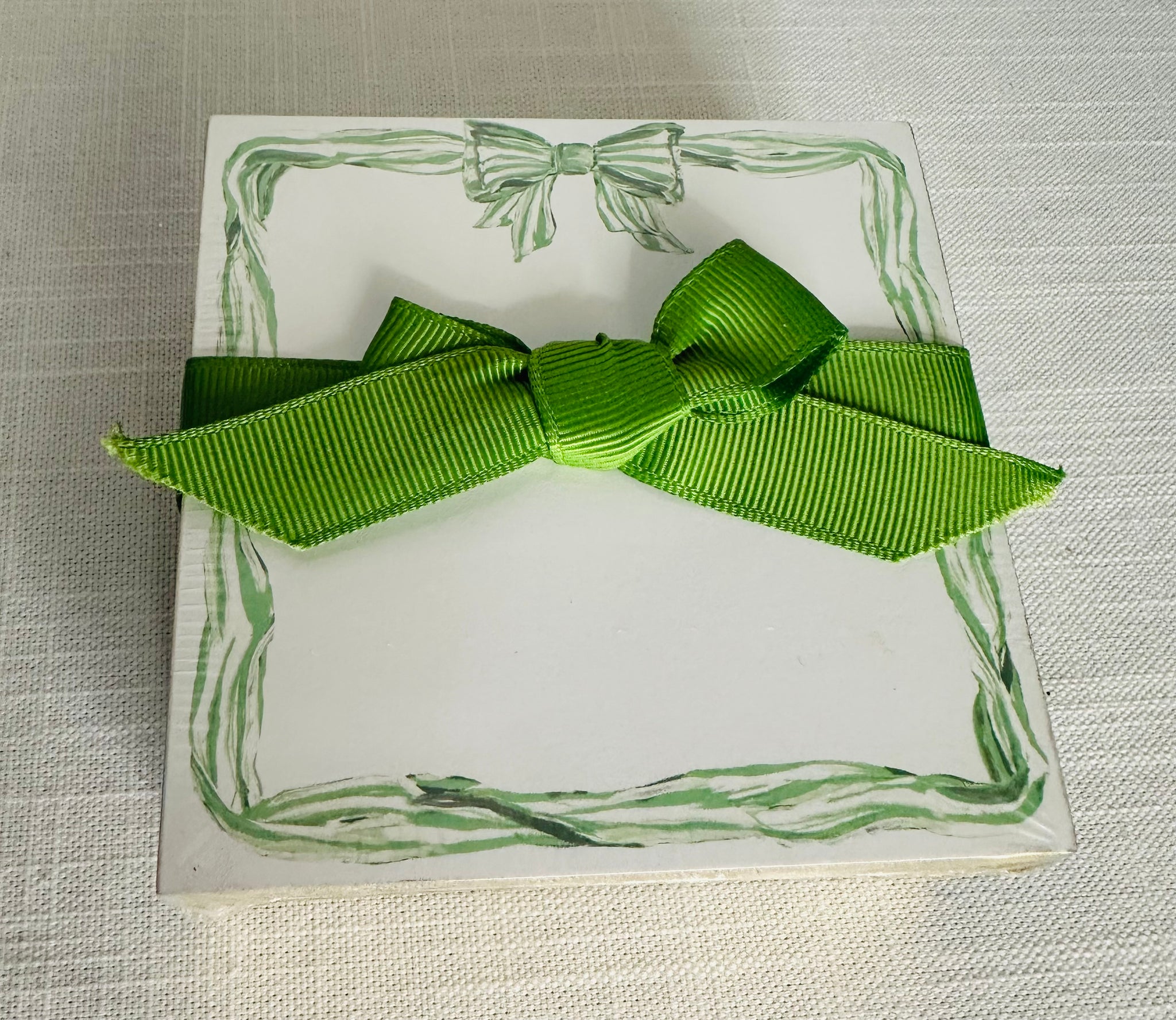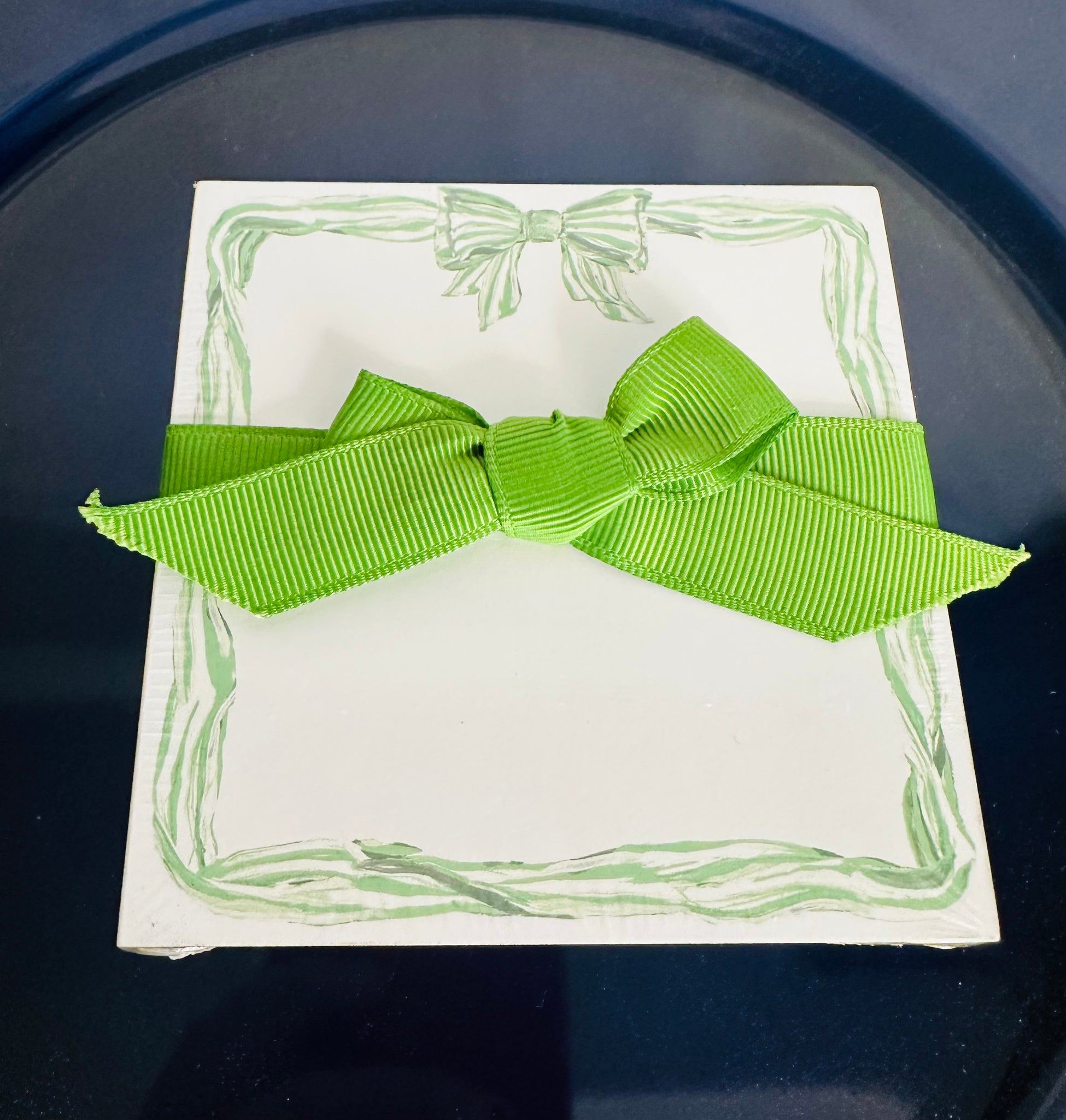 This Lauren Dunn mini notepad has 100 4 x 4 sheets of card stock. The notepad has a green and white border and gold edges. These come shrink wrapped with a green bow. This makes a perfect gift for an occasion.