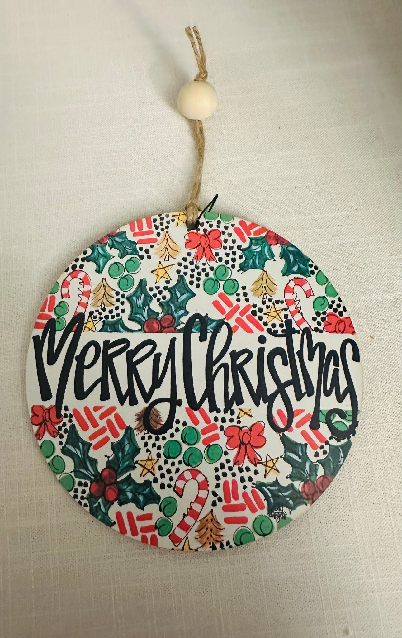 The round wooden ornament has symbols of Christmas and Merry Christmas wording across the center.