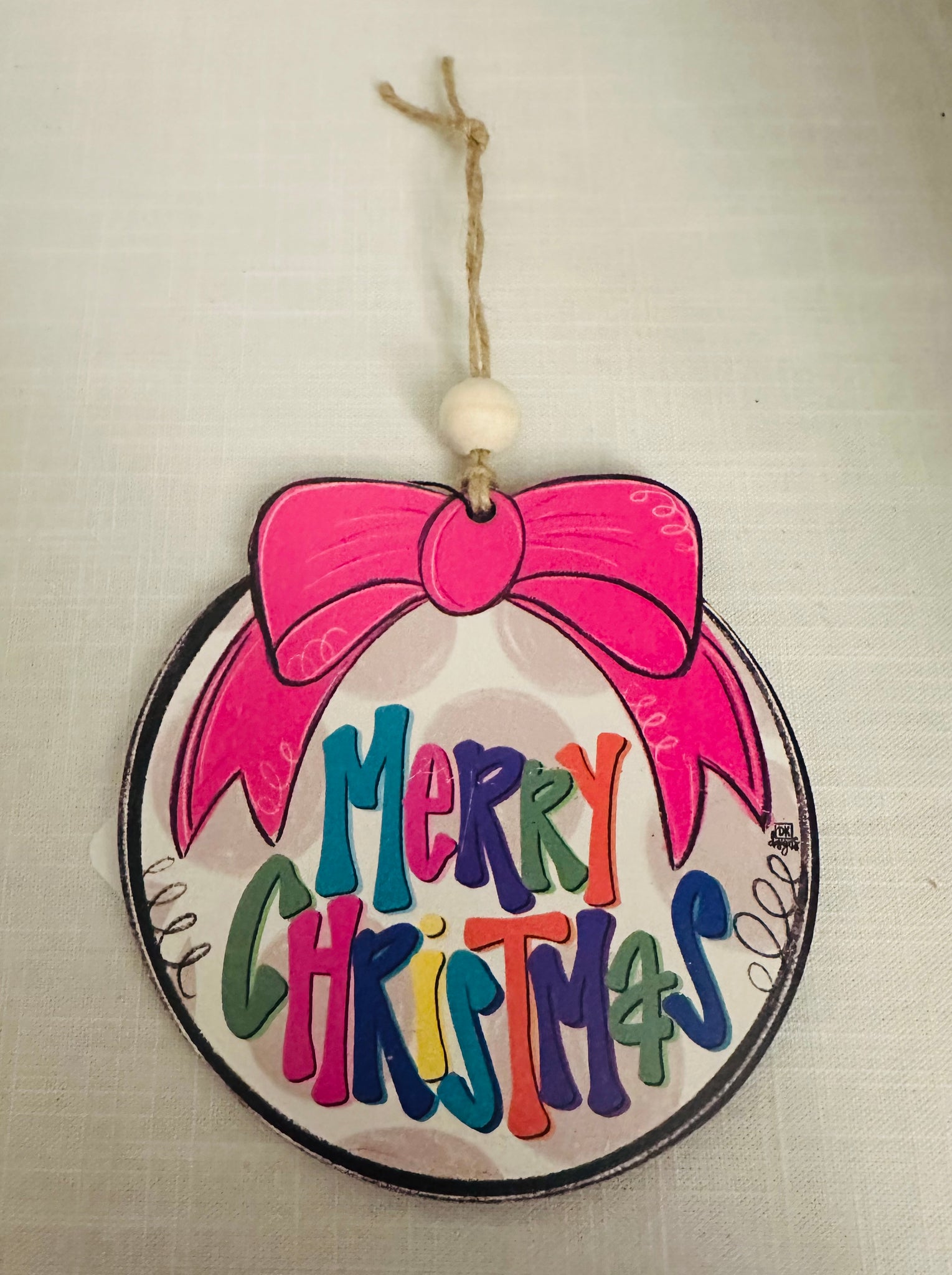 This Merry Christmas ornament is bright and festive and is accented with a pink bow.